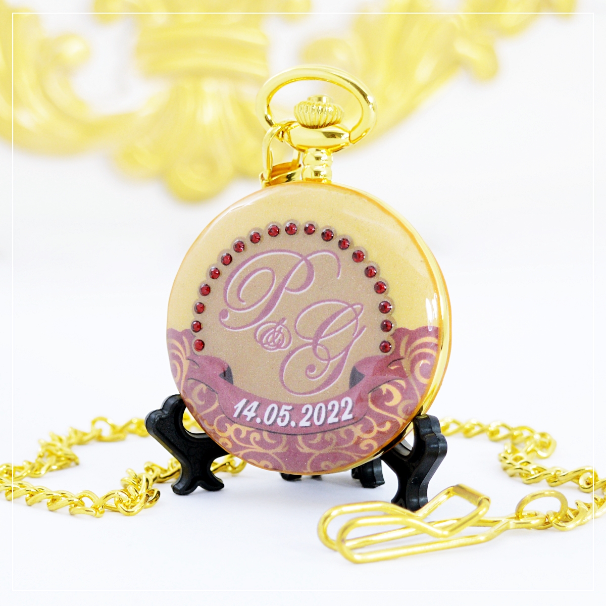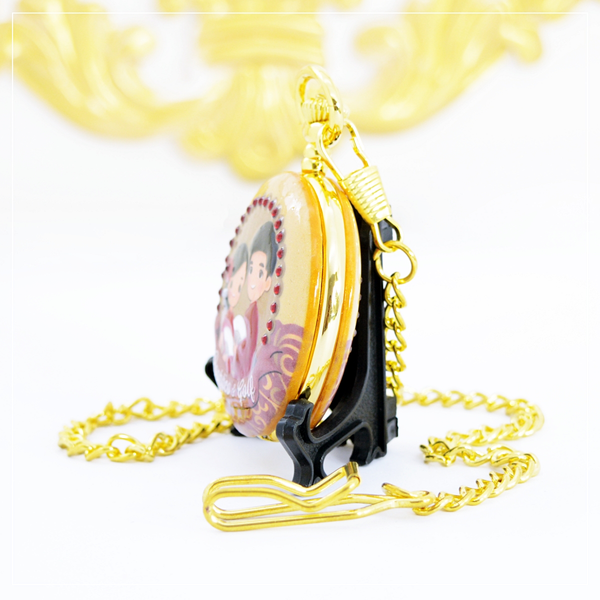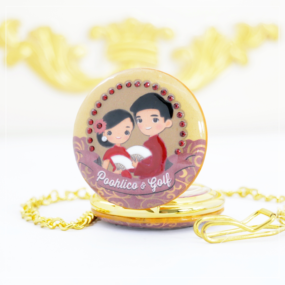 ของขวัญแต่งงานสไตล์จีน ดีไซต์ คู่บาว- สาว อาหมวย-อาตี๋ ออกแบบมาเป็น ของขวัญแต่งงานของขวัญแต่งงานมอบให้คนจีน นาฬิกาพก ของขวัญสุดหรู ลูกค้าสามารถแจ้งอักษรย่อของตัวเองได้ตามต้องการ) ฝาหลังนาฬิกาเป็นสามารถใส่รายละเอียดของ ว/ด/ป หรือ อักษรย่อ ของวันพิเศษๆได้ตามต้องการ ตัวเรือนขนาด 4.7ซม. เป็นระบบถ่านควอทซ์ เครื่องญี่ปุ่น หน้าปัดเป็นประดับคริสตัลมุกชมพูเข้ม เหมาะซื้อของขวัญให้เพื่อนชาวจีน