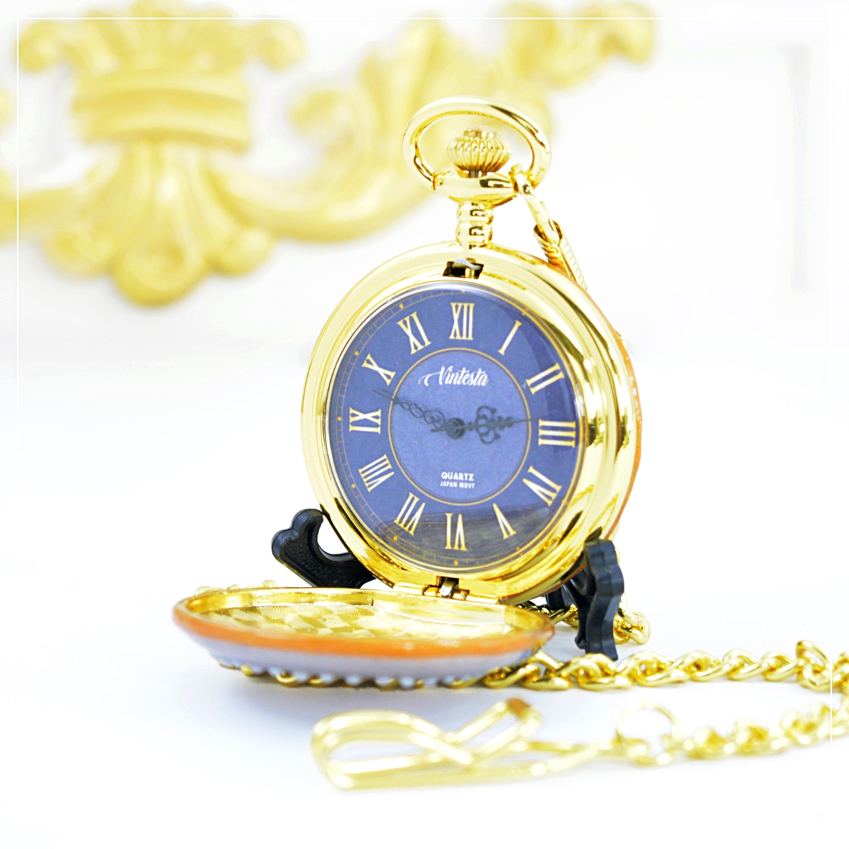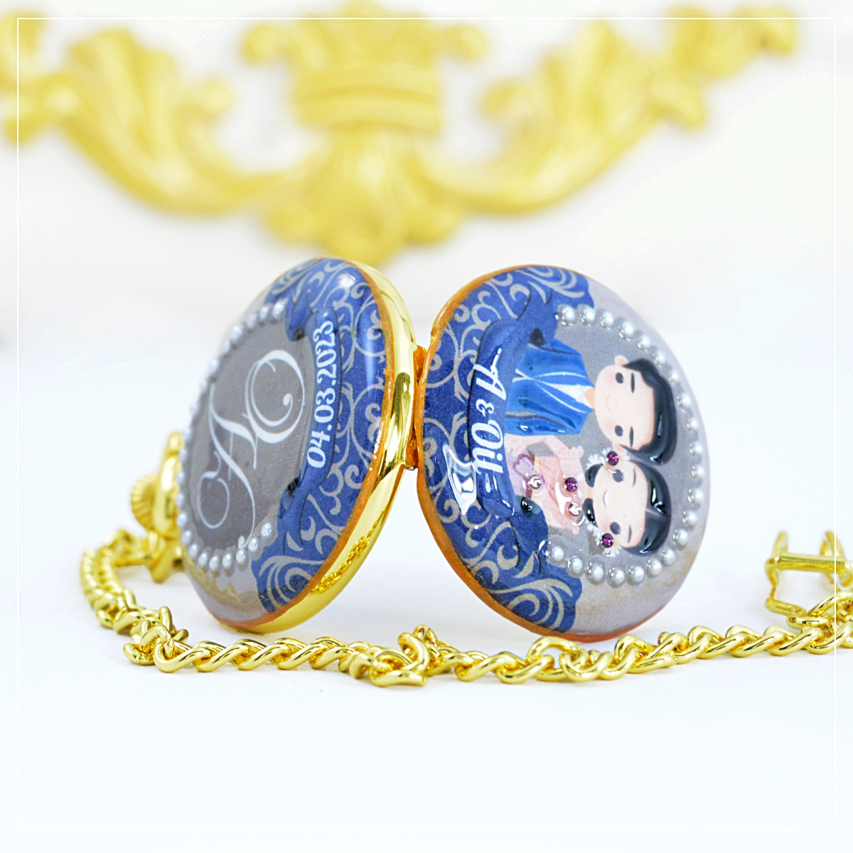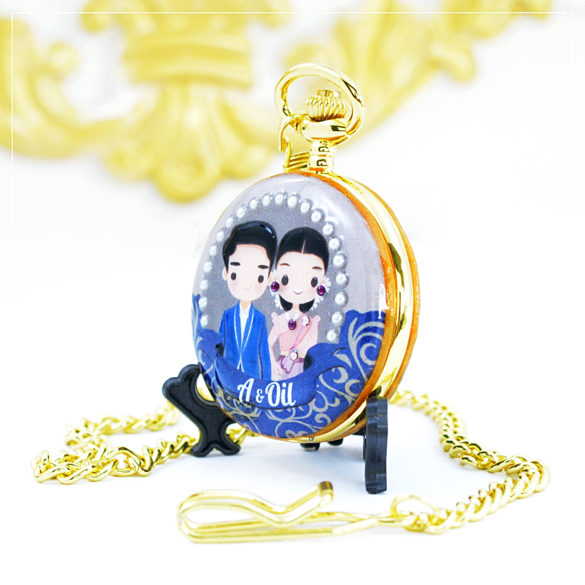 ของขวัญแต่งงาน ดีไซต์ คู่บาว- สาว ไทยคอลเลคชั่น ออกแบบมาเป็น ของขวัญแต่งงานสไตฃ์ไทยๆ นาฬิกาพก ของขวัญสุดหรู ฝาหน้าของนาฬิกาเป็นลวดลายลูกไม้สีน้ำเงินตัดน้ำตาล ตรงกลางประดับ "คริสตัลมุก" (ลูกค้าสามารถแจ้งอักษรย่อของตัวเองได้ตามต้องการ) ฝาหลังนาฬิกาเป็นสามารถใส่รายละเอียดของ ว/ด/ป หรือ อักษรย่อ ของวันพิเศษๆได้ตามต้องการ ตัวเรือนขนาด 4.7ซม. เป็นระบบถ่านควอทซ์ เครื่องญี่ปุ่น หน้าปัดเป็นระบบอารบิค เหมาะเป็นนาฬิกาที่ระลึกพรีเมียมในโอกาศต่างๆ