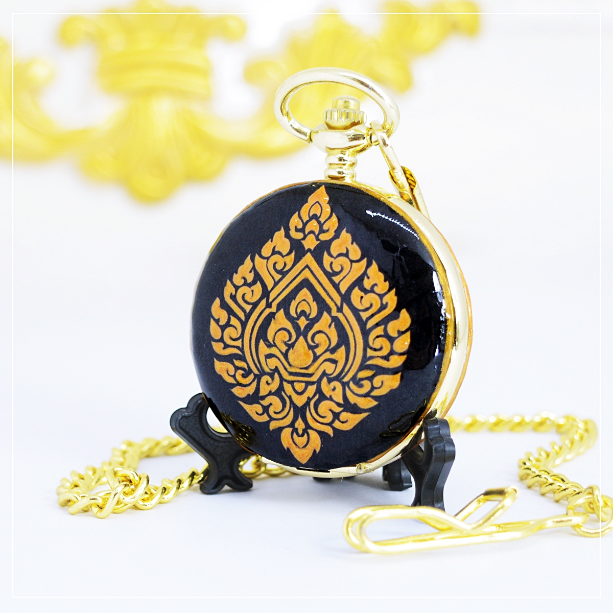ของที่ระลึกไทย ลวดลายพุ่มข้าวบิณฑ์ โบราณ ของขวัญแบบไทยๆ หรู เอกลักษณ์ไทย รุ่นนาฬิกาพกลายไทย ระบบนาฬิกากลไกไขลานแบบโบราณ ลวดลายไทยวาดเส้นด้วยช่างศิลป์ทั้งเรือน ฝาหน้า-หลัง (ระยะเวลาการผลิตจะนานกว่ารุ่นอื่นๆนะคะ) บนตัวเรือนนาฬิกาพก รุ่นพรีเมี่ยม เปิดได้2ด้าน Double Hunter Pocket Watch in Thai Ancient Design อีกทั้งยังสามารถใส่ชื่อหรือข้อความได้ที่ฝาหลังอีกด้วย