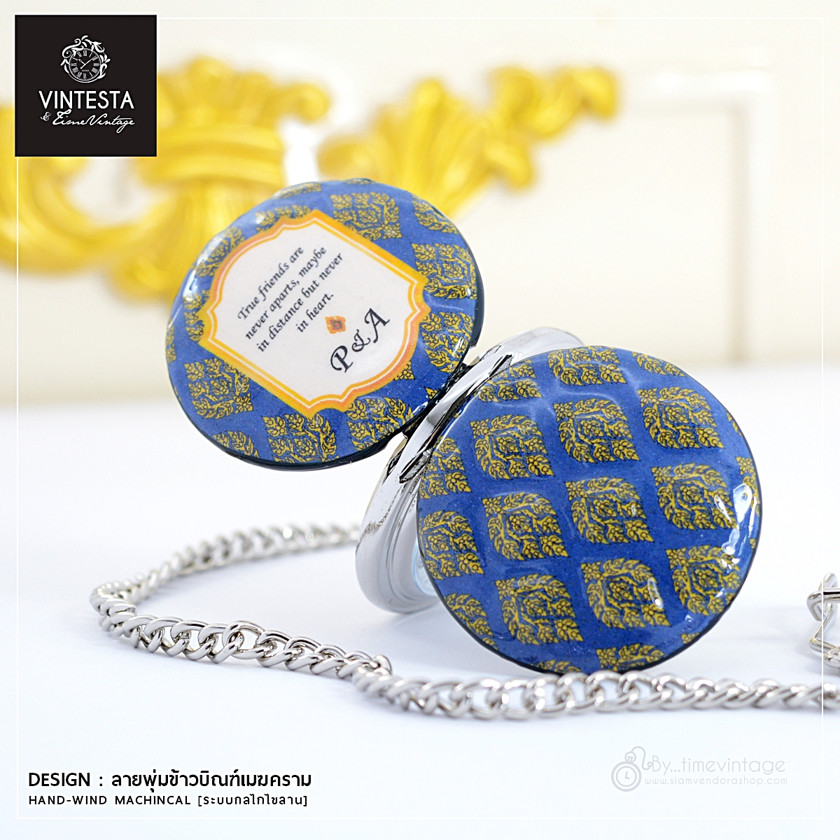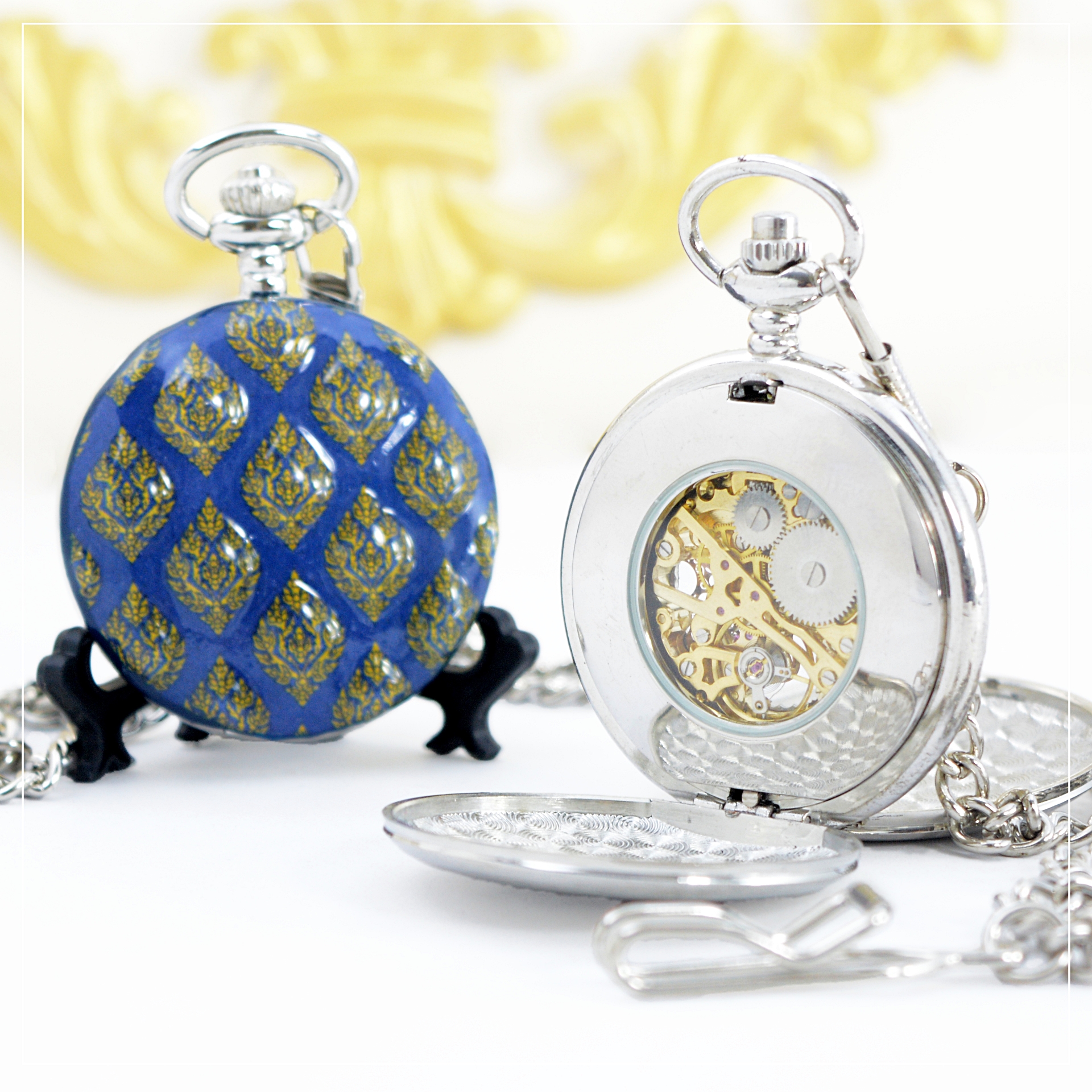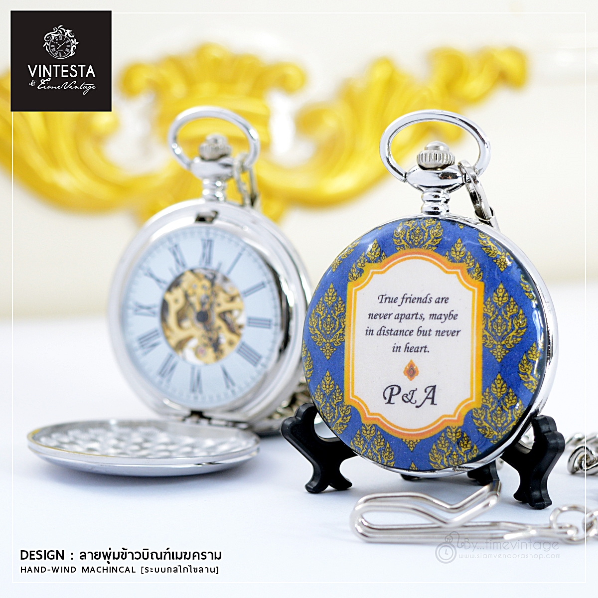 ของขวัญไทย l ของฝากไทยที่ต่างชาติประทับใจ คอลเลคชั่น นาฬิกาพกลายไทยโบราณ ระบบนาฬิกากลไกไขลาน ของที่ระลึกไทยๆ ลวดลายลายพุ่มข้าวบิณฑ์เมฆคราม ฟังชั่นพิเศษเฉพาะนาฬิกาพกลวดลายไทยพรีเมียม โดยรุ่นนี้จะมีระบบเครื่องนาฬิกา 2 ระบบ คือ 1. ระบบถ่านควอทซ์ญี่ปุ่น (ใช้แบตตารี่) และ 2. ระบบไขลาน (ไขลานมือทุกๆ 5 ชั่วโมง) อีกทั้งนาฬิกาพกยังสามารถใส่ข้อความ l ชื่อ หรือ LOGO ได้ทั้งฝาด้านนอก และ ใต้ฝา เพิ่มความพิเศษให้กับของขวัญเรือนนี้