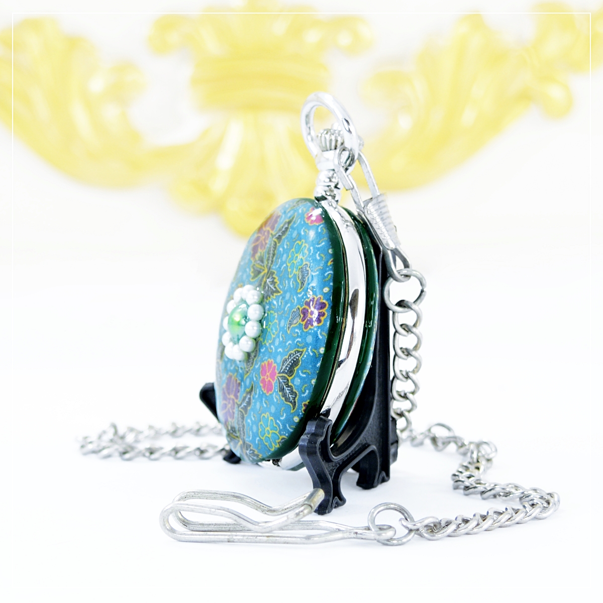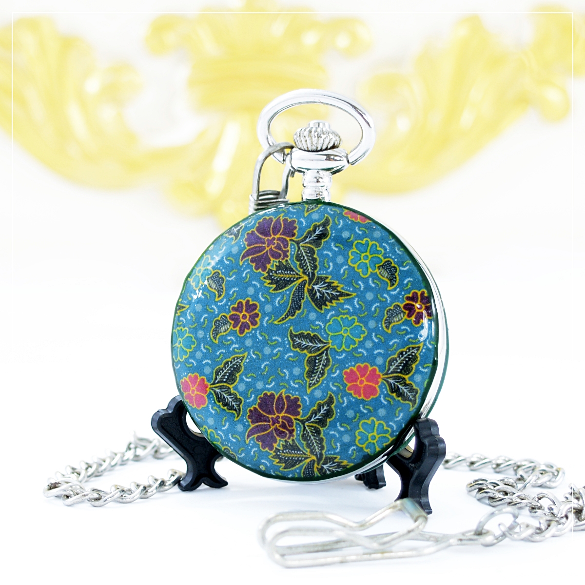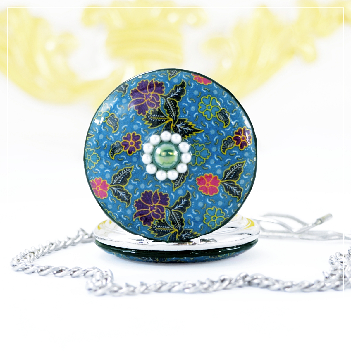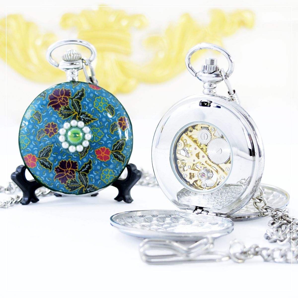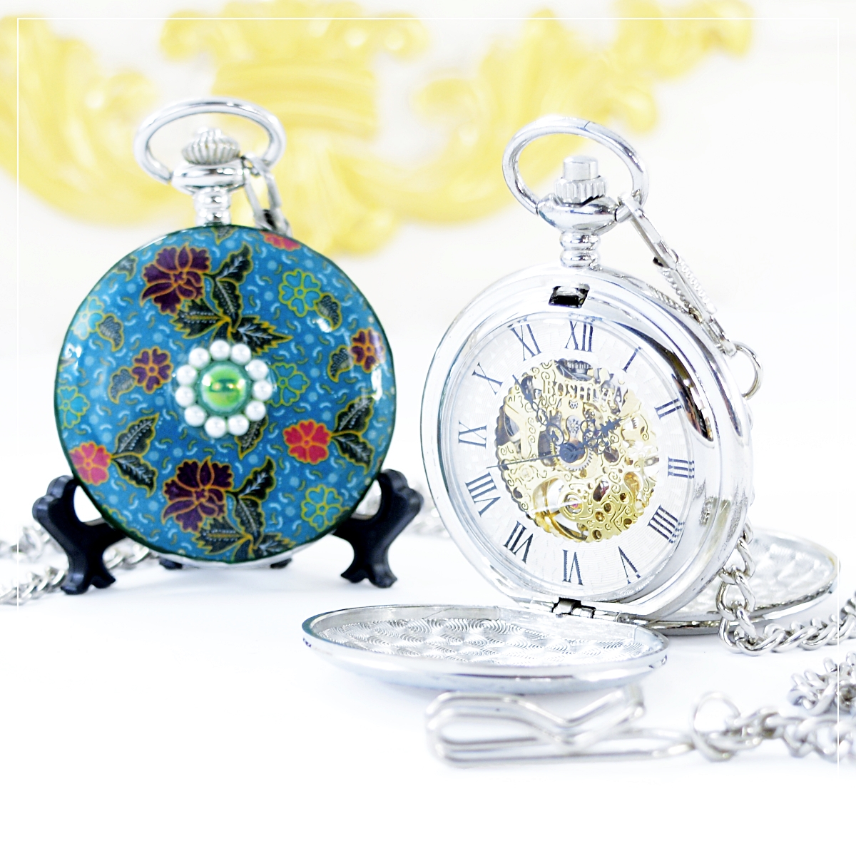ของขวัญไทยๆ ชุดของฝากจากไทยให้ต่างชาติ ของที่ระลึกไทยภาคใต้ รุ่นนาฬิกาพของที่ระลึกบาติกไทย ลวดลายดอกขาวปูเต๊ะ ของที่ระลึกจากไทย ลวดลายและการตกแต่งลงบนตัวเรือน งานทำมือพรีเมี่ยมสุดพิเศษ นาฬิกาพกรุ่นนี้มีระบบเครื่องในเลือก 2 ระบบ คือ ระบบถ่านควอทซ์ญี่ปุ่น และ ระบบไขลาน อีกทั้งนาฬิกาพกสีเงินเรียบรุ่นนี้ยังเหมาะกับการสลักชื่อหรือข้อความได้ทั้งฝาหน้าและหลังอีกด้วย แบบของที่ระลึกพร้อม LOGO