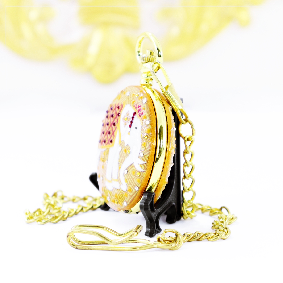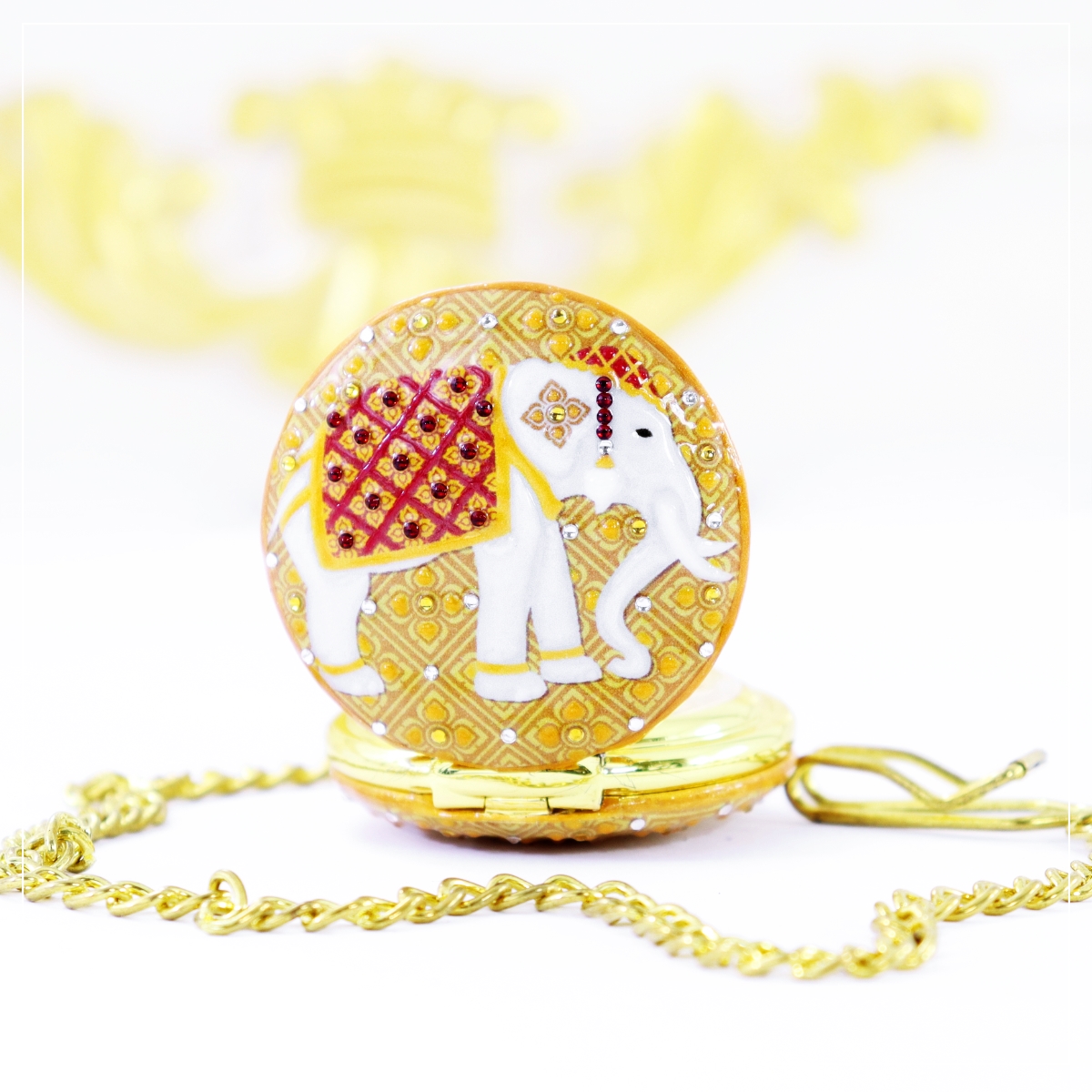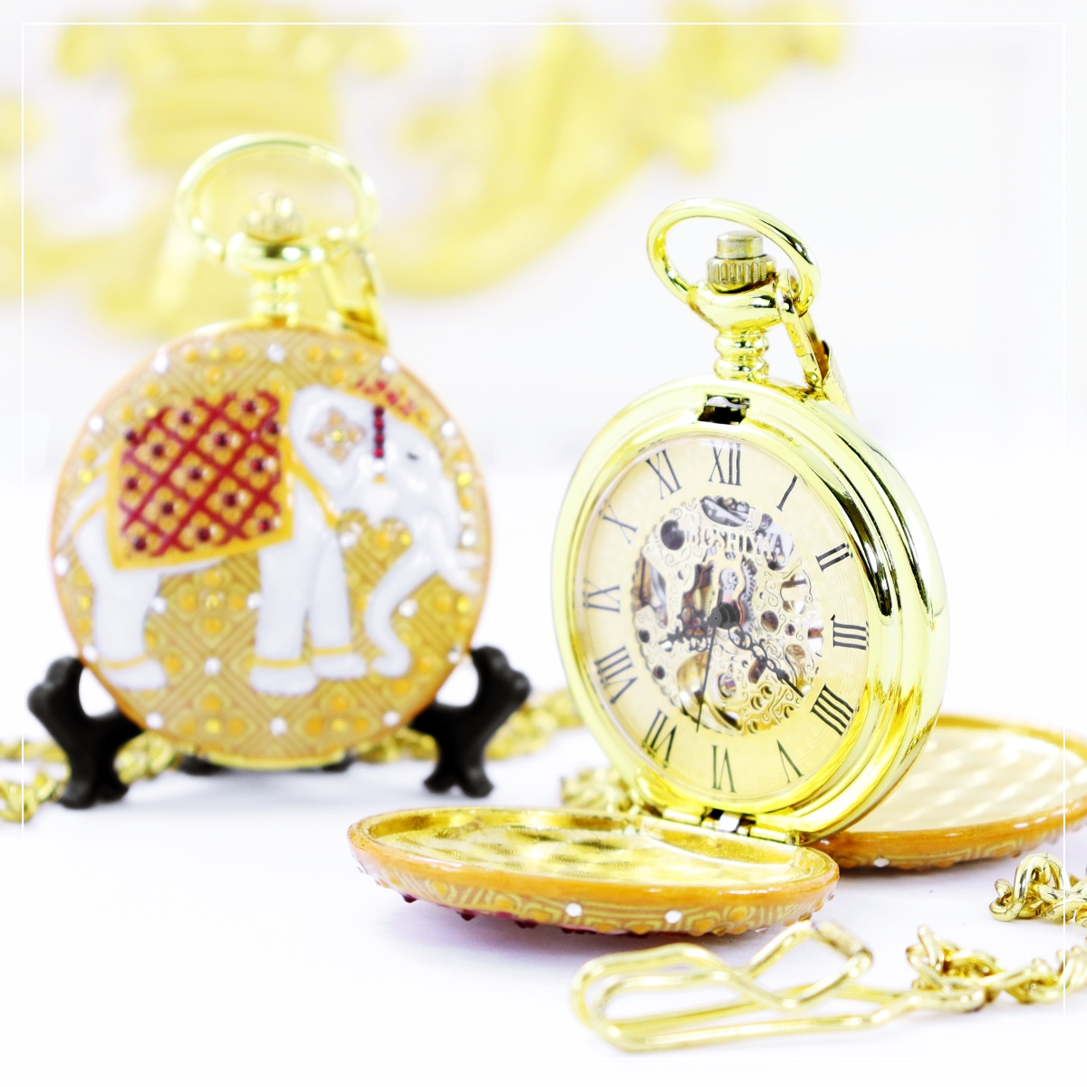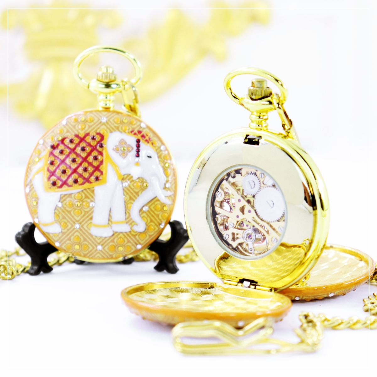 ของที่ระลึกช้างไทย ของขวัญของฝากช้างไทย รุ่น นาฬิกาพกแฮนด์เพ้นท์ ช้างไทย ลวดลาย คชามาศ ของที่ระลึกของไทย นาฬิกาพกช้างไทย มีให้เลือก 2 ระบบ คือ ระบบถ่านควอทซ์ญี่ปุ่น (ใช้แบตตารี่) และ ระบบไขลาน (ไขลานมือทุกๆ 5 ชม.) อีกทั้งนาฬิกาพกยังสามารถใส่ข้อความ l ชื่อ หรือ LOGO ได้ทั้งฝาด้านนอก และ ใต้ฝา เป็นของเพิ่มความพิเศษให้กับของขวัญเรือนนี้