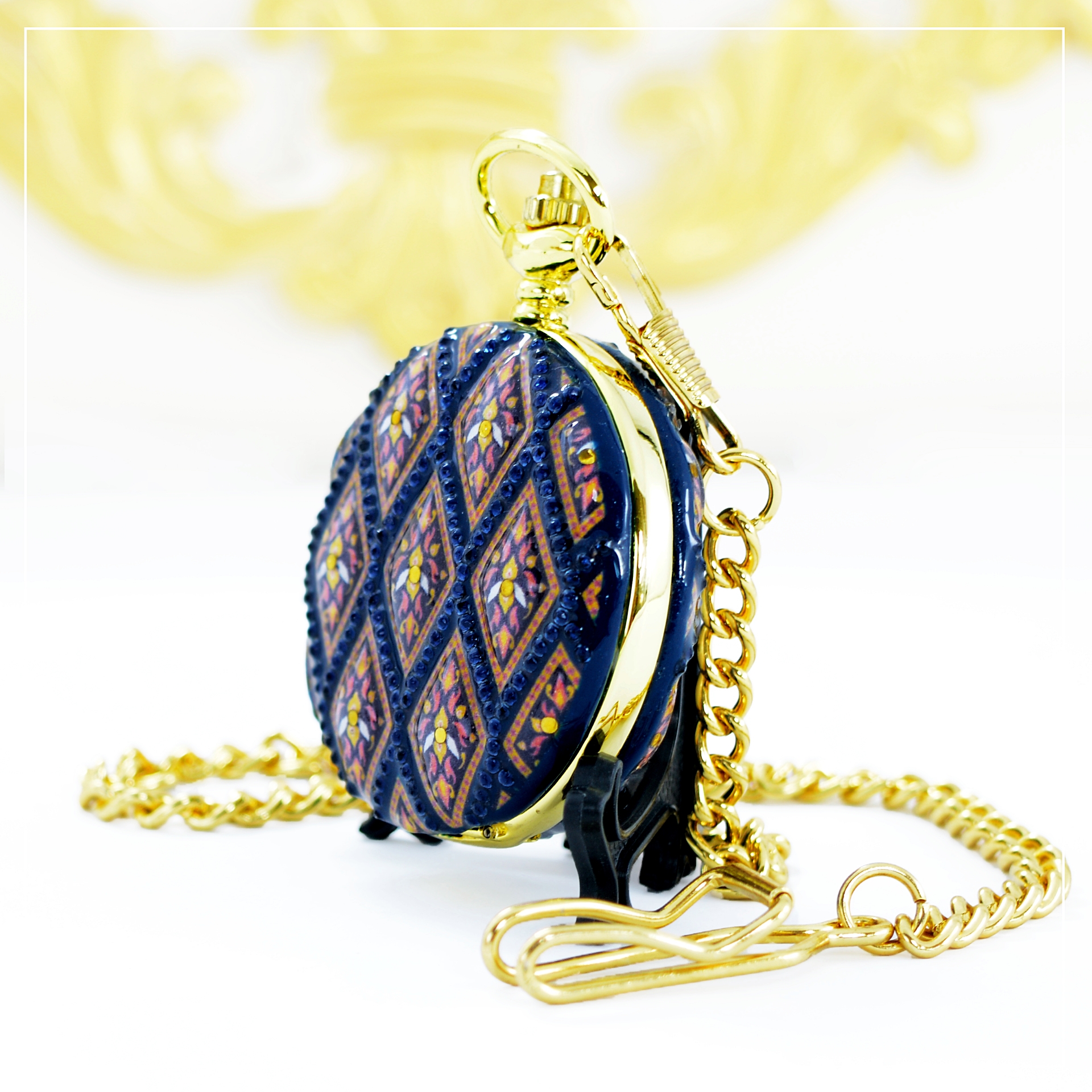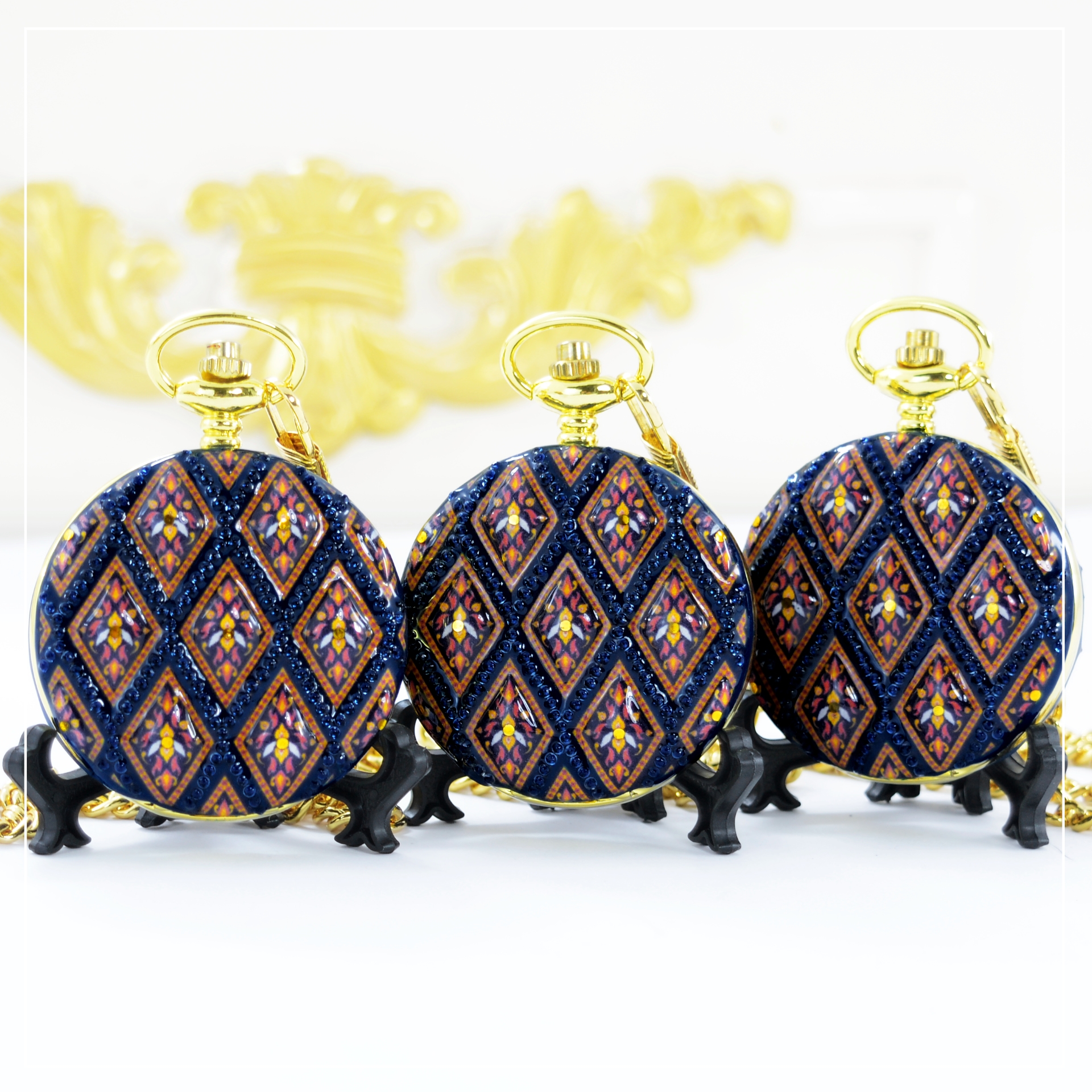 ของที่ระลึกไทย คอลเลคชั่น นาฬิกาพก ที่ออกแบบด้วย ลวดลายผ้าไทยประยุกต์ เข้ากับ ตัวเรือนนาฬิกาพก โครงเนื้อโลหะอัลลอยด์สีทอง นั้นเป็นหนึ่งใน ของที่ระลึก ที่โดดเด่นและมีความเป็นเอกลักษณ์ เหมาะสำหรับมอบเป็น ของขวัญไทยๆ ในโอกาสพิเศษต่างๆ ไม่ว่าจะเป็น ของที่ระลึกในงานประชุม, ของขวัญสำหรับผู้บริหาร, หรือของที่ระลึกสำหรับแขกผู้มาเยือนจากต่างประเทศ